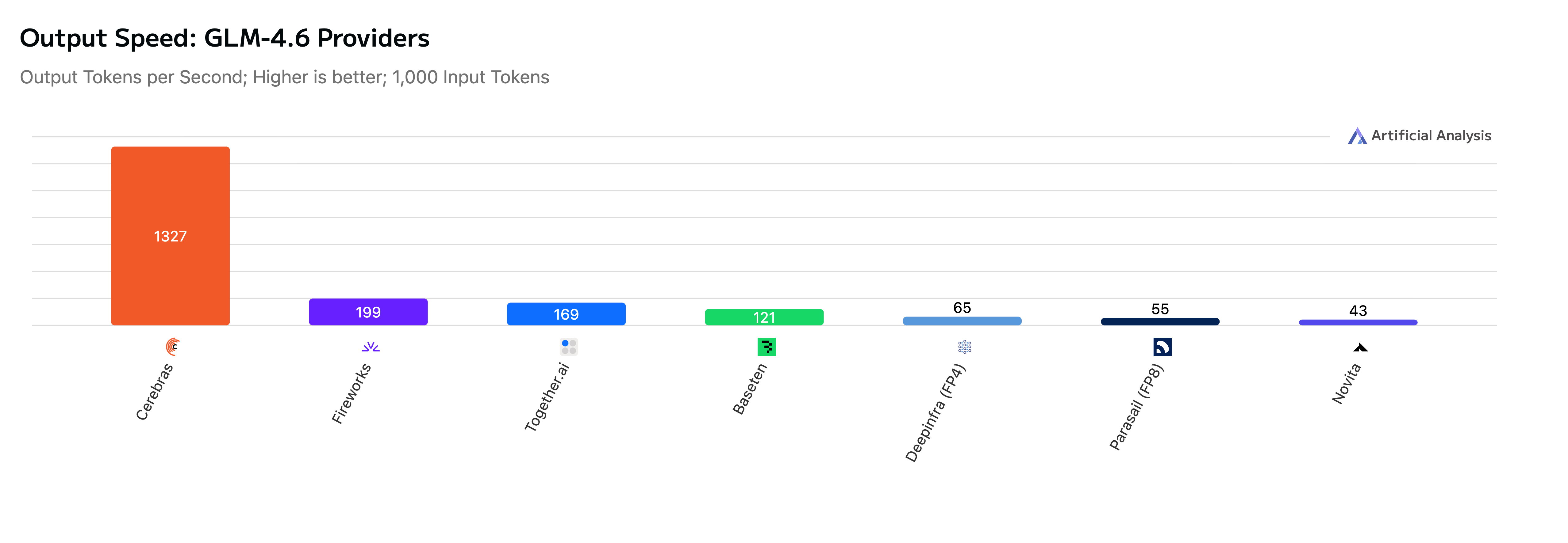 - Speed: On Cerebras, GLM 4.6 achieves output speeds of up to 1000+ tokens per second, making it 20x faster than closed-source competitors like Sonnet 4.5. This significantly reduces latency in agentic workflows, allowing for rapid iteration and execution in development environments.